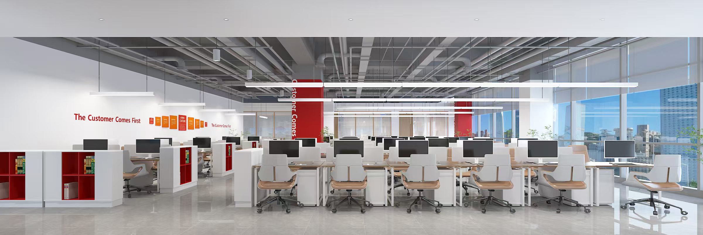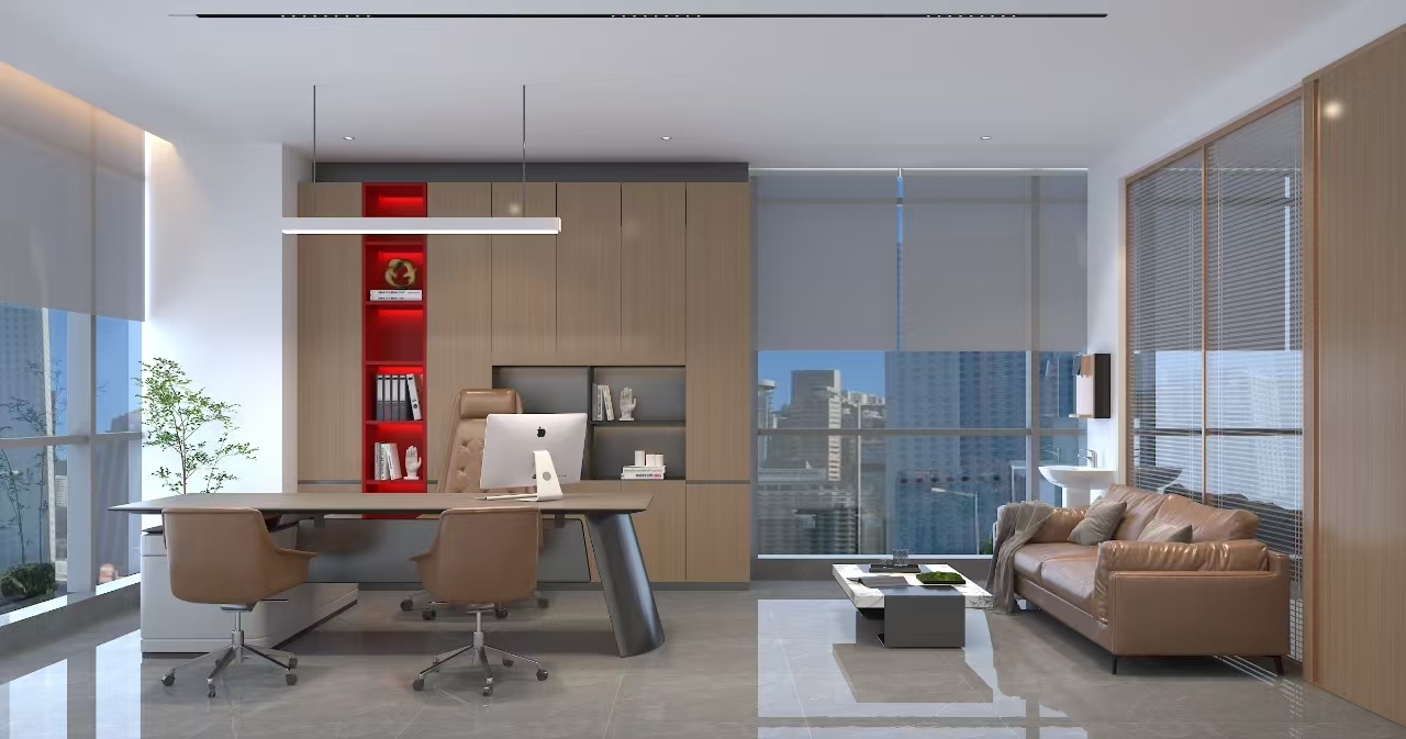 本次辦公空間設計,以現代簡約風格為主導。前臺采用大理石與木質元素結合,展現大氣與溫暖;茶水間木色柜體搭配藝術掛畫,營造舒適休閑氛圍;開放辦公區(qū)通透明亮,紅白配色點綴,傳遞活力與 “客戶至上” 理念;會議室簡潔大氣,滿足高效會議需求;總裁辦公室則在簡約中融入精致軟裝,平衡辦公與休憩功能,整體空間通過材質、色彩與布局的巧妙運用,打造出既專業(yè)高效又舒適宜人的辦公環(huán)境。