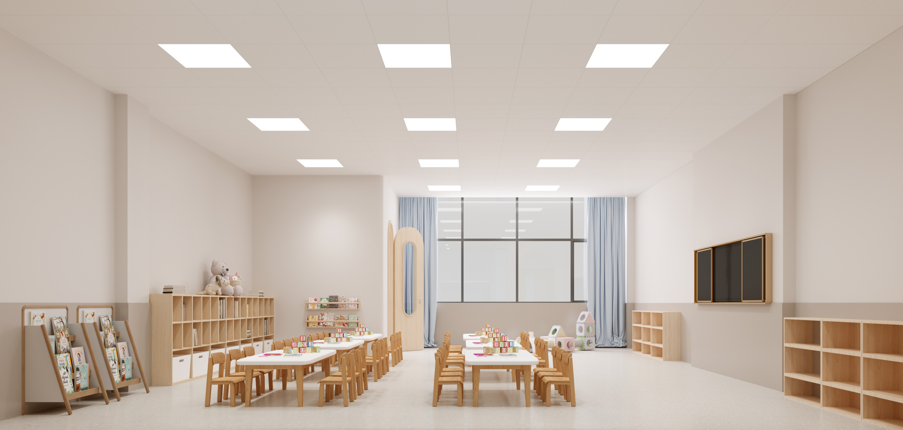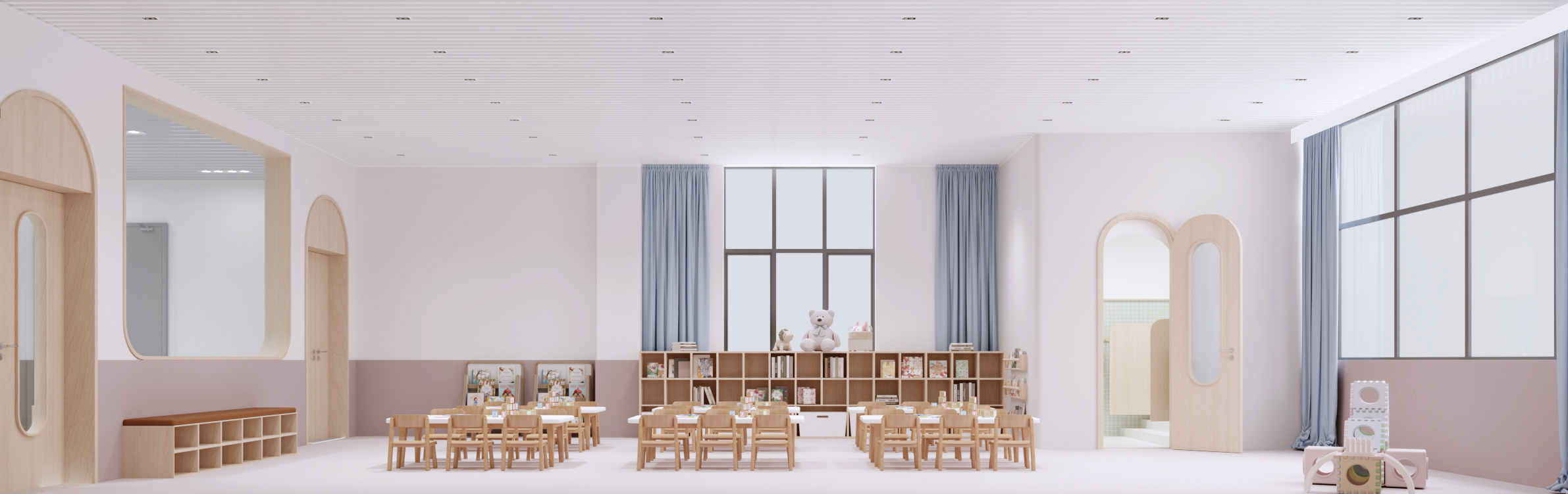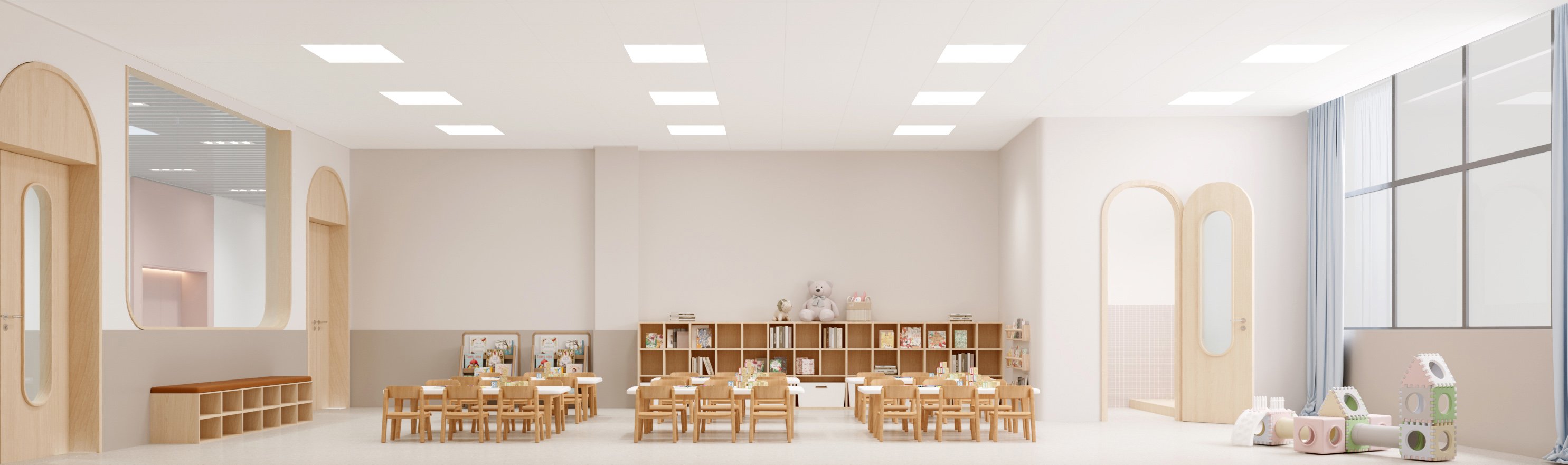 本校園設(shè)計以 “賦能成長,融多元美學(xué)與實用功能” 為核心??臻g運(yùn)用柔和色調(diào)與木質(zhì)元素,營造溫馨氛圍。教室布局規(guī)整,采光充足,配套童趣設(shè)施與收納空間,助力學(xué)習(xí)與探索。走廊線條簡潔,色彩搭配活潑,兼具通行與展示功能。公共區(qū)域如大廳,通過簡約家具與品牌標(biāo)識,彰顯校園文化;閱讀區(qū)以弧形書架、多彩坐凳,打造舒適閱讀場景。整體設(shè)計既契合教育需求,又以靈動、溫暖的視覺語言,為師生構(gòu)建優(yōu)質(zhì)學(xué)習(xí)生活環(huán)境。